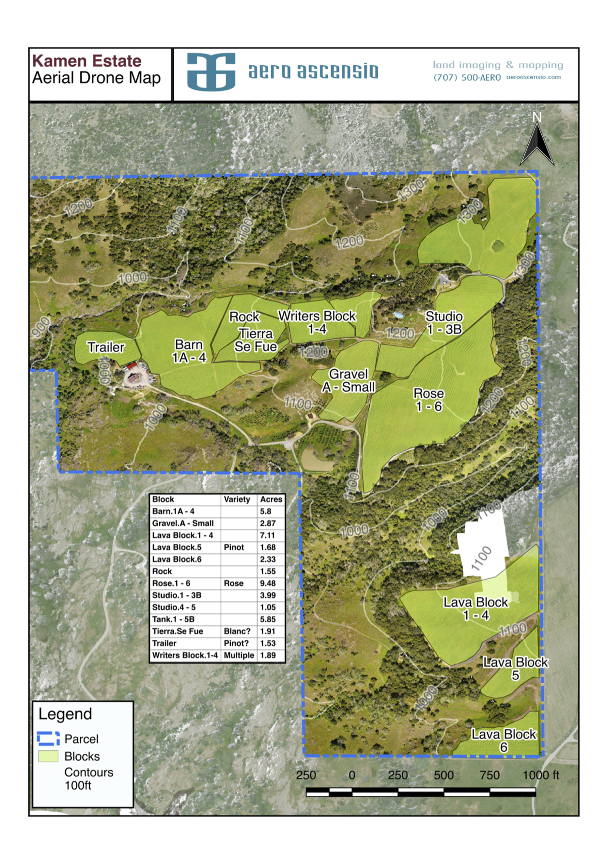 There are a number of reasons one might want to image map a property in addition to taking individual aerial photos or video. A vineyard developer, manager or engineering company might want to image map a property in order to analyze slope and contour data to determine plantable acreage for instance, or to run analysis and estimates for providing equipment access and land development. Vineyard owners and managers might want to look at particular aspects of a vineyard or vineyard block during the growing season to analyze irrigation issues, manage fertilization and pests, perform root counts or monitor plant health, absentee builders and property owners may want to monitor the progress of construction projects, or property owners may simply want a single contiguous high resolution image of their property that they can view or print for their own purpose.