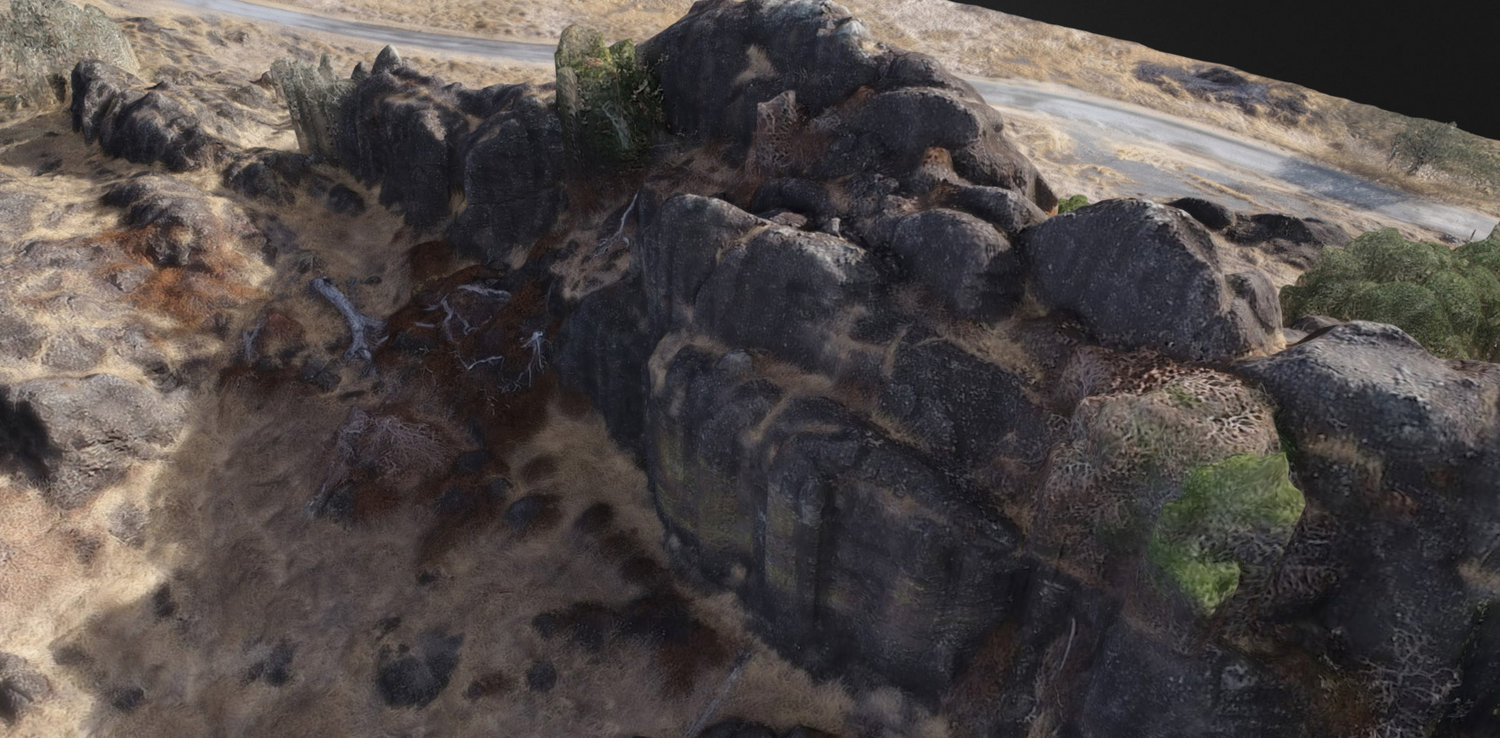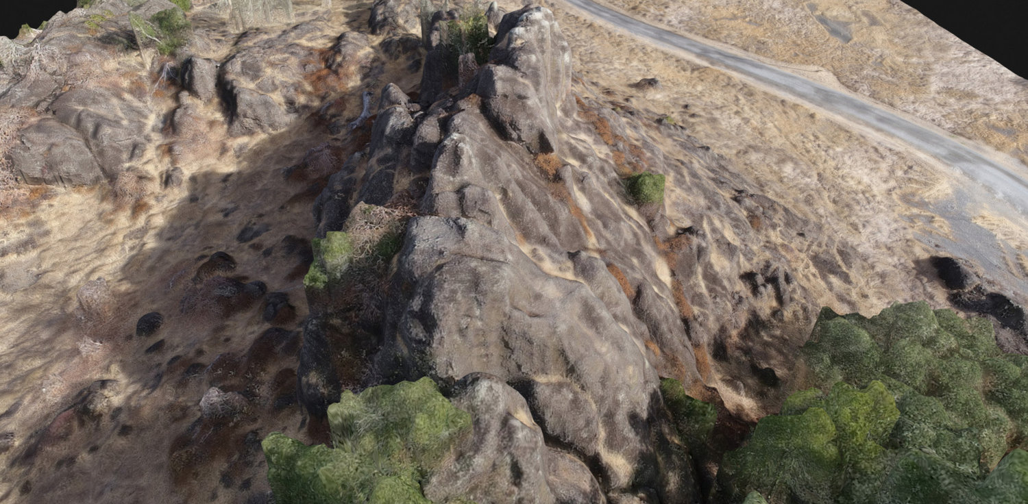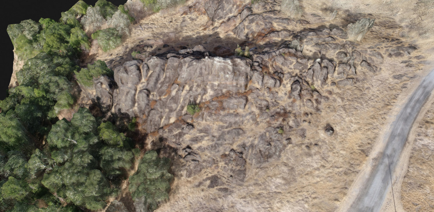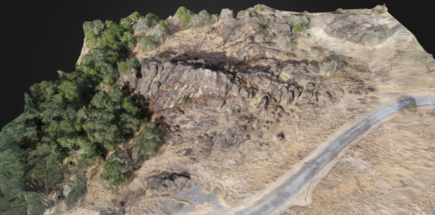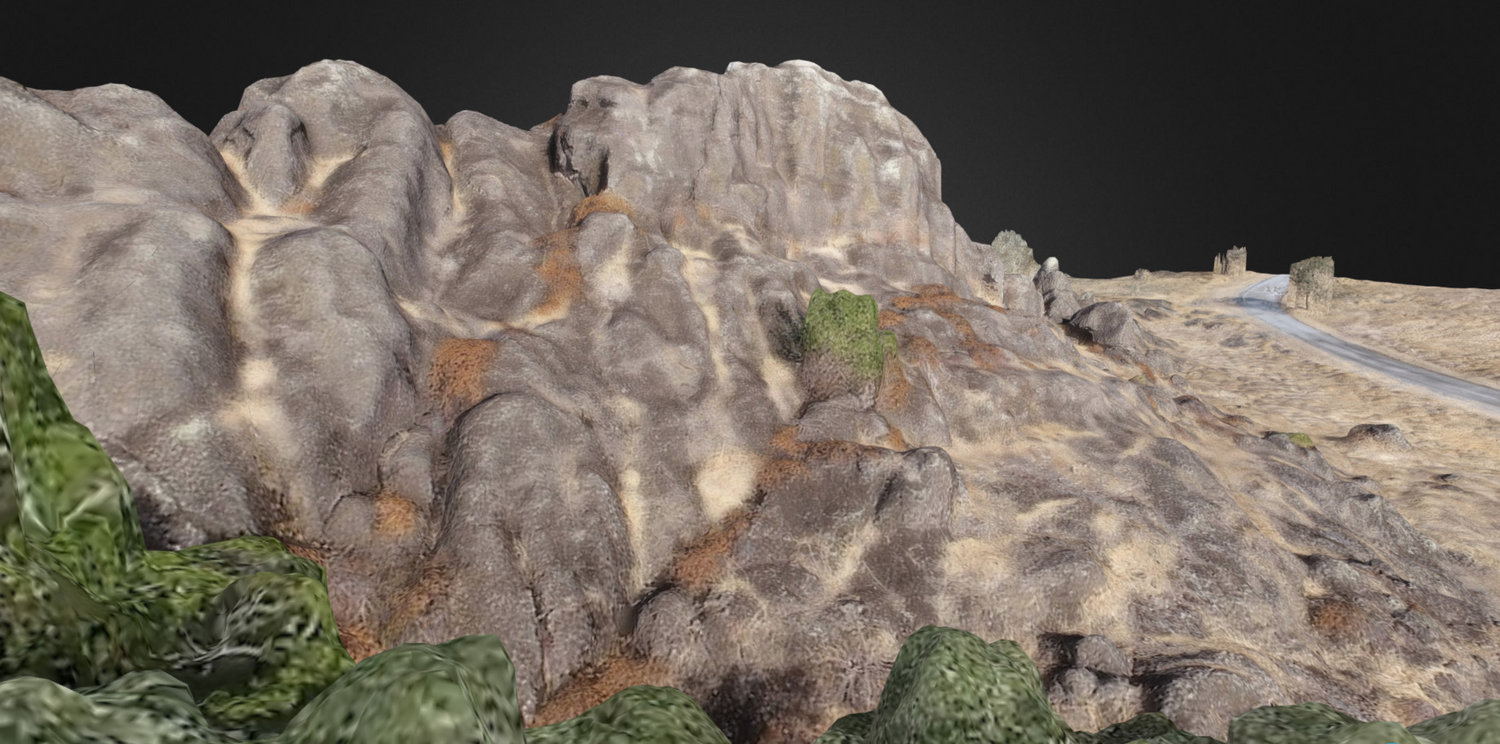 Screenshots captured from a 3D virtual model of a rock formation created using aerial imagery from our Phantom 4 Pro. The images are then uploaded to DroneDeploy and turned into a 3D model which can be manipulated in real time, including Zoom, title, and rotate.